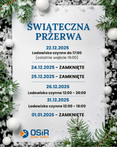 Drodzy Goście, przedstawiamy harmonogram pracy lodowiska w okresie świąteczno-noworocznym, abyście mogli zaplanować swoje zimowe wizyty z wyprzedzeniem . 22.12.2025 Lodowisko czynne do 17:00 Ostatnie wejście: