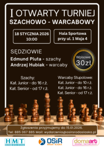 Zapraszamy wszystkich miłośników królewskiej gry i warcabów z powiatu średzkiego na I Otwarty Turniej Szachowo-Warcabowy, który odbędzie się: 18 stycznia 2026 r. (niedziela) godz. 10:00